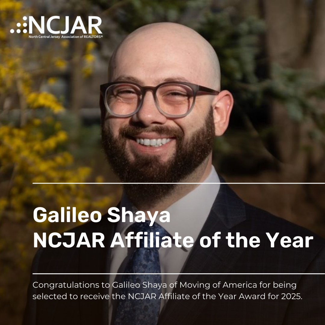 Congratulations to Galileo Shaya of Moving of America for being selected to receive the NCJAR Affiliate of the Year Award for 2025. The Affiliate of the Year award is bestowed on an Affiliate Member who has been actively involved with the North Central Jersey Association of REALTORS® contributing time and energy in supporting the Association’s initiatives.